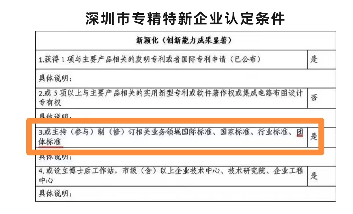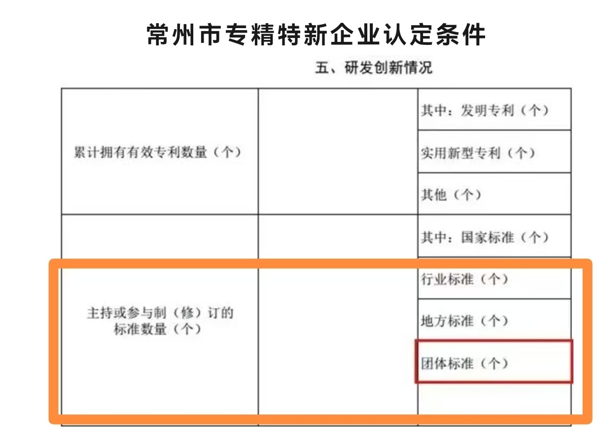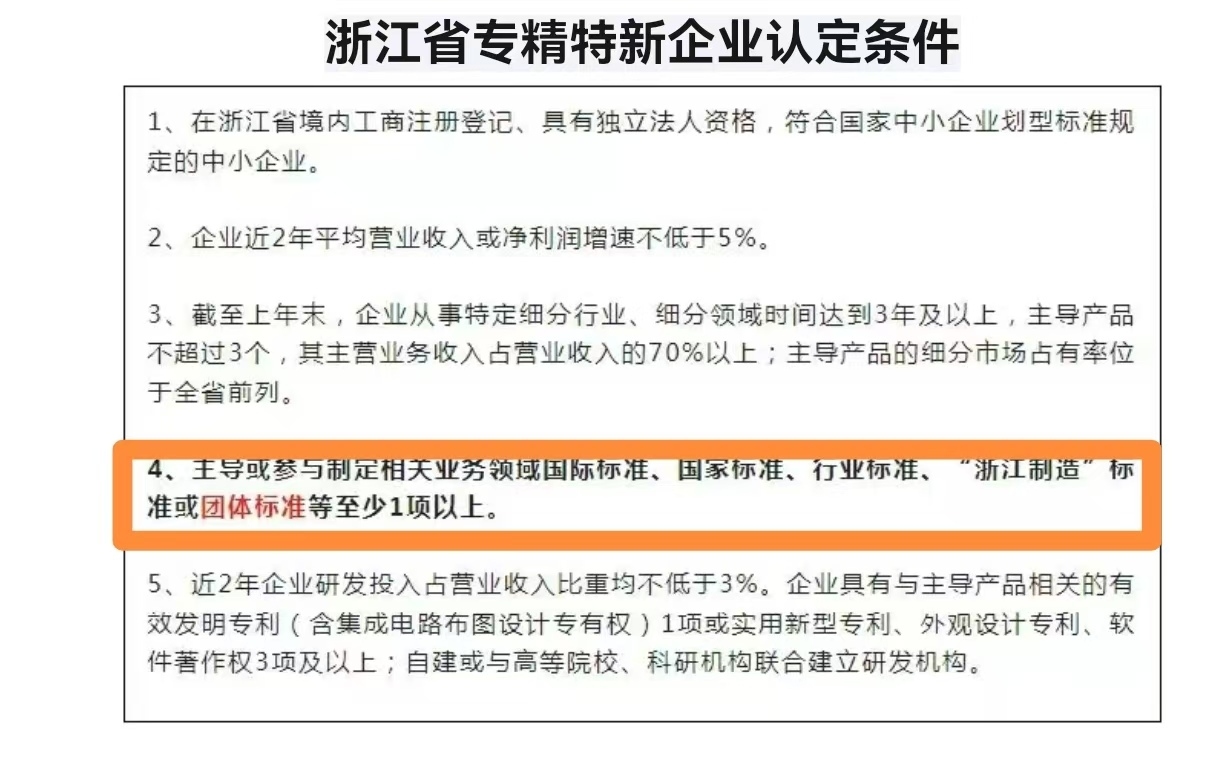 专精特新中小企业认定标准第三条特色化指标(满分15分)由省级中小企业主管部门结合本地产业状况和中小企业发展实际自主设定1-3个指标进行评价,现有部分省市(浙江省、常州市、深圳市等)将参与制(修)订团体标准与国际标准、国家标准、行业标准同列入相应的加分项目,每满足一项加2分。